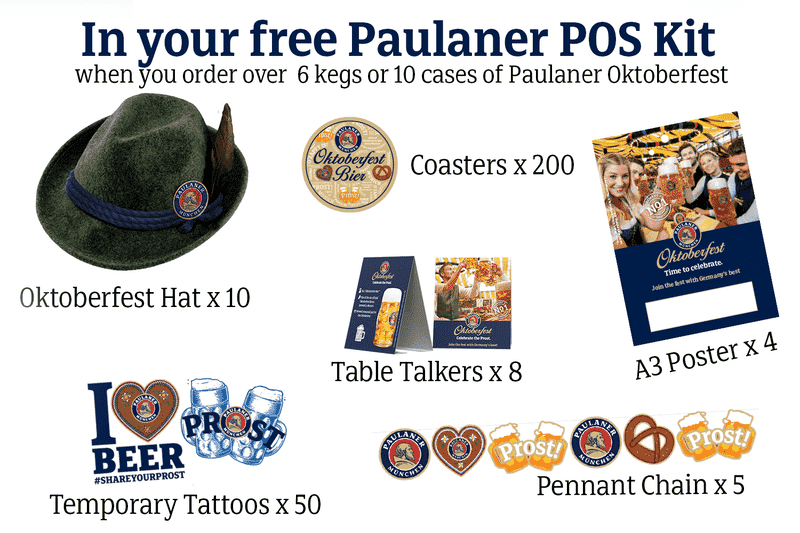 We have two set POS kits available to grab. If you order 6+ kegs of Paulaner Oktoberfest/Party kegs, or 10+ cases of Paulaner Oktoberfest cans & bottles, you will receive a Paulaner POS kit. If you order 6+ kegs of Hacker Oktoberfest or 10+ cases of Hacker Oktoberfest you will receive a Hacker POS kit - while stocks last. However, if you are looking to host something bigger we are here to help support you. We are looking for venues to be official Paulaner Oktoberfests, if this is something you think you'd be interested in let your sales manager know! please contact your Account Manager and we can arrange further availability.
